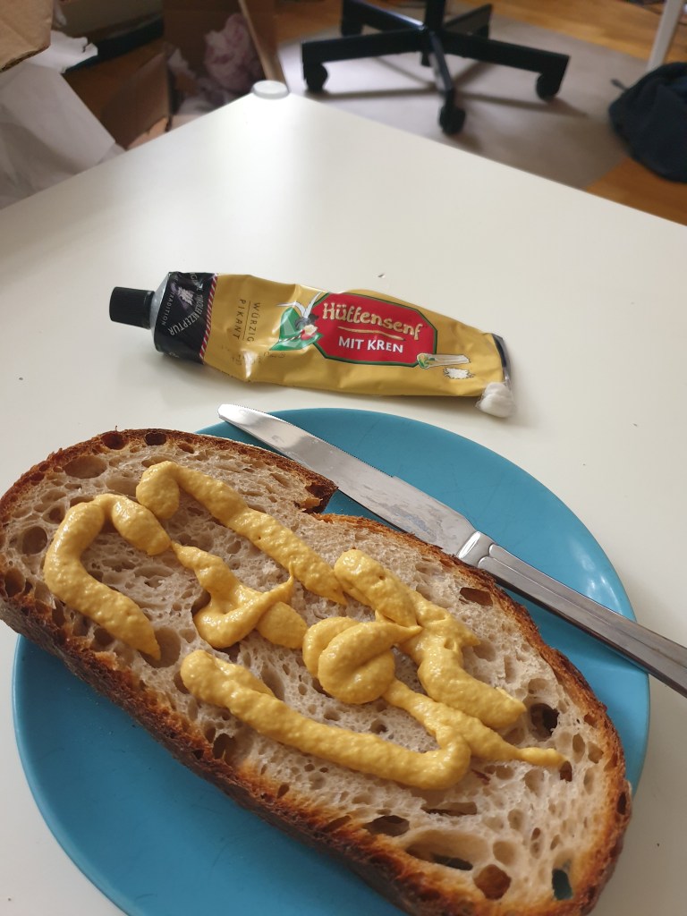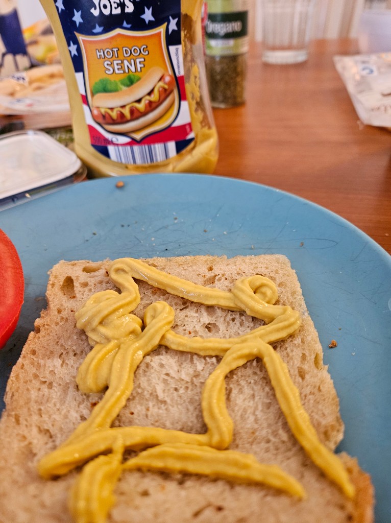 05.07.2023. Erster Senf: liebes Senf. Er schmeckt sehr pink-lila, und passt (auch farblich) zu Hähnchenwurst und Brot. Ich fühle die Liebe.