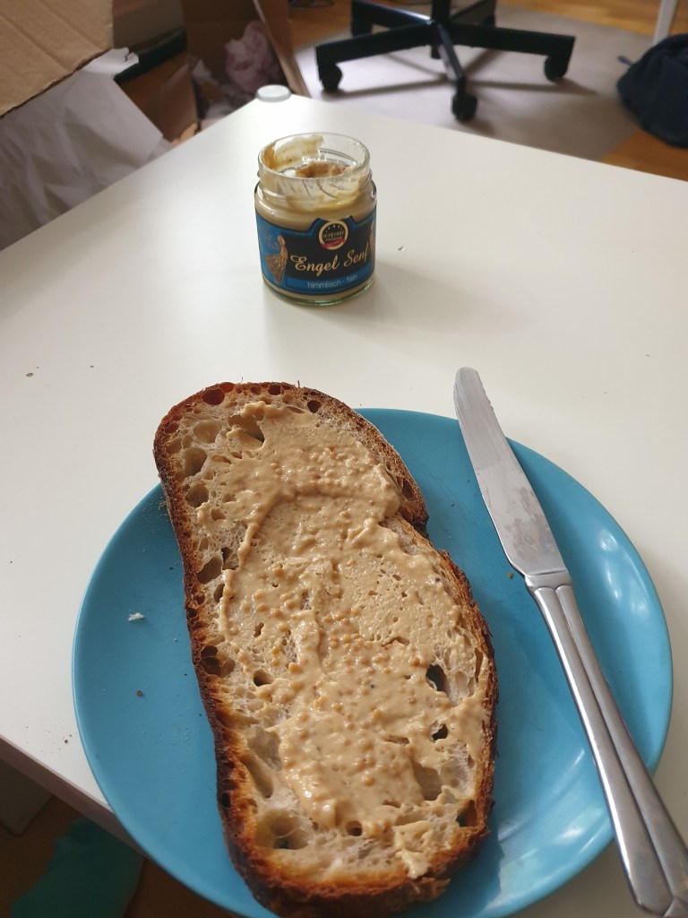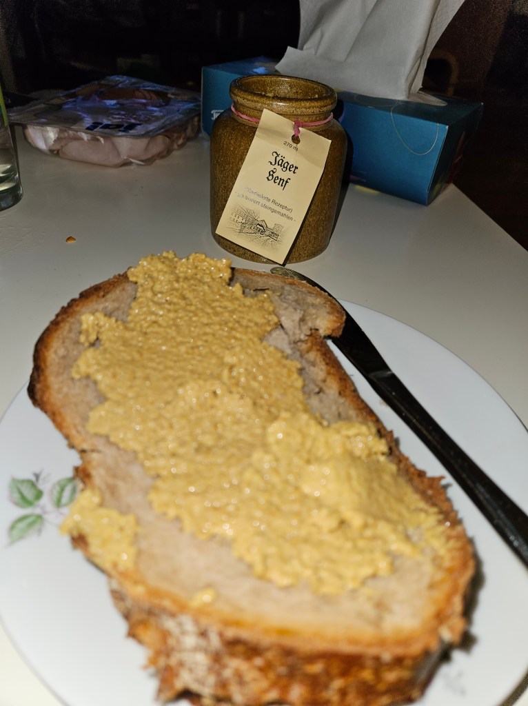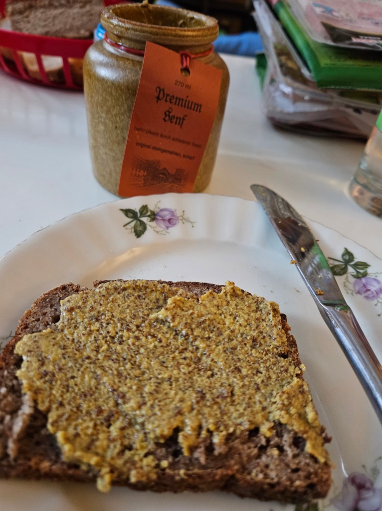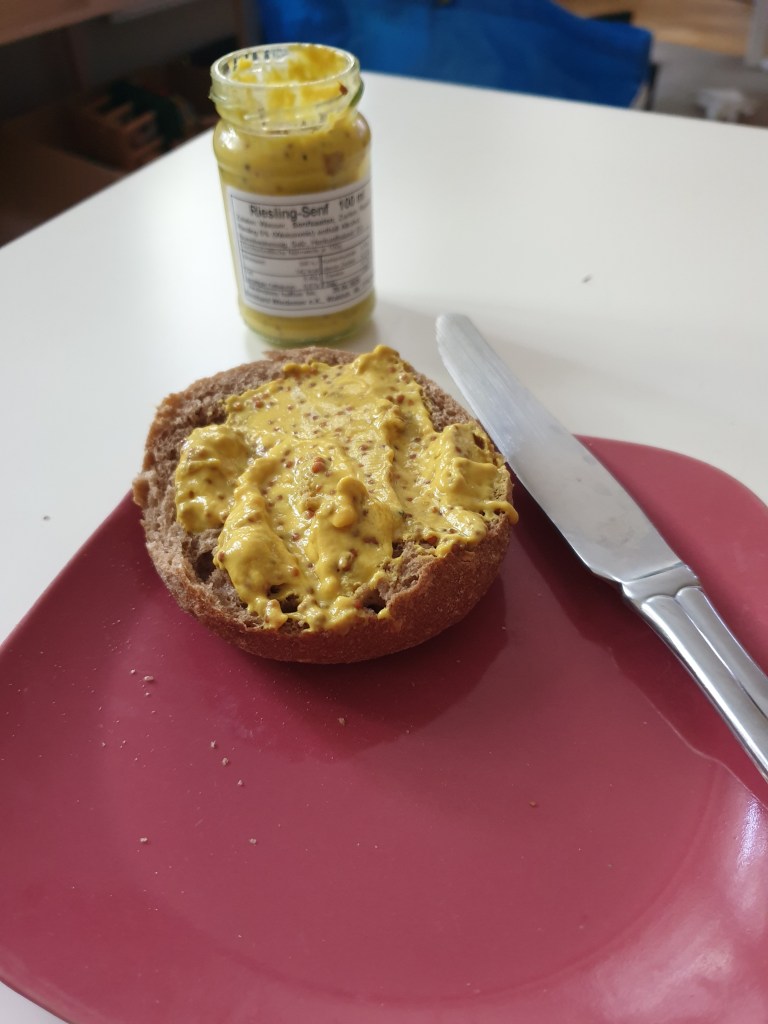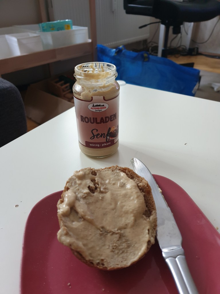 06.08.2023. Der nächste Senf, ein Rouladen-Senf, den ich auf einem Brot unverschämt misbraucht habe. Dieser Senf war ]ziemlich würzig und pikant, wie das Glas versprach. Ich habe ein kleines schlechtes Gewissen, weil ich diesen Senf nicht mit einer Roulade esse, aber der schöne Geschmack von ihm hilft mir damit klar zu kommen.