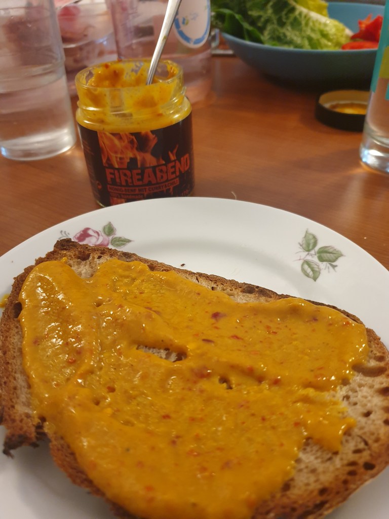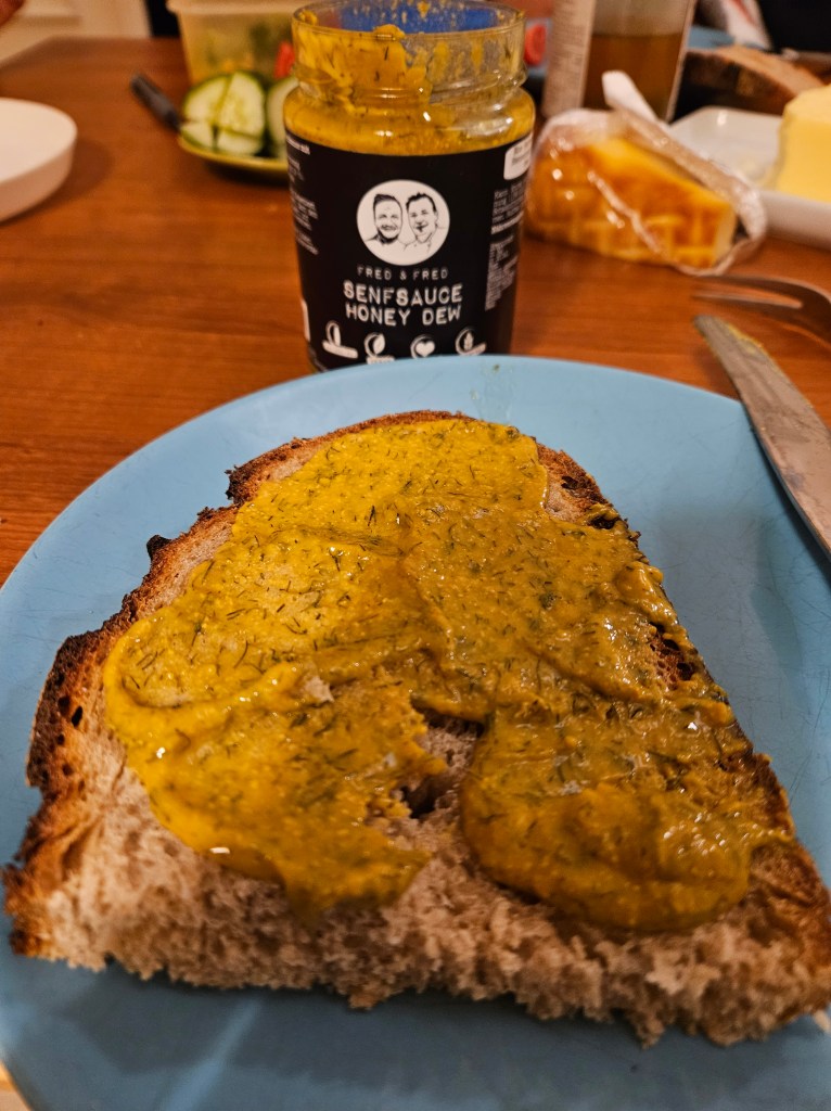 27.07.2023. Der Engel Senf ist leider zum Himmel aufgegangen, deswegen war Fred & Fred’s “Senfsauce Curry Bombay” auf dem Tisch bzw. dem Brot. Meine erste Begegung mit diesem Senf war sehr erfreulich! Man könnte es eigentlich Curry-Aufstrich nennen, aber man schmeckt eine leichte Senfnote (keine Anspielung auf die Senfonie war damit gemeint). Auf jeden Fall ist der Senf/Aufstrich äußerst lecker. Ich freue mich auf ein morgiges Zweitkosten, um ihn besser zu bewerten. Im Moment steht er auf dem ersten Platz unter den Senfen.