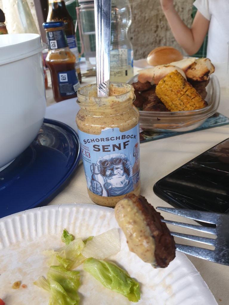 02.09.2023. Eine Art Biersenf wurde beim Grillen geteilt. Dieser Senf enthält alkohol, was viele eher abgeschreckt hat. Nichtdestotrotz wurde festgestellt, dass der Senf gut zum Grillfleisch passt.