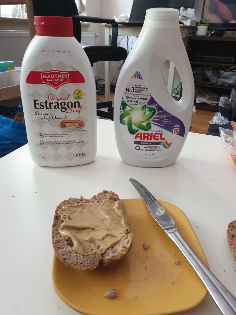 06.09.2023. Endlich ist es so weit: die größte Senfflasche überhaupt habe ich aufgemacht. Und jetzt gibt’s ein kleines Quizchen: Im Foto (siehe unten) müsst ihr raten, welche Flasche Senf enthält, und welche Flasche ist für Waschmittel. Es ist gar nicht so einfach. Im Übrigen war der Senf lecker, allerdings konnte ich nicht feststellen, dass er tatsächlich nach Estragon schmeckt.