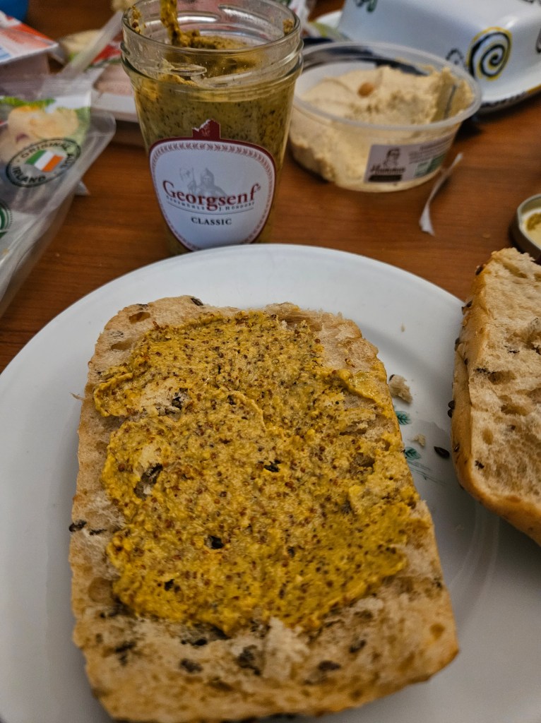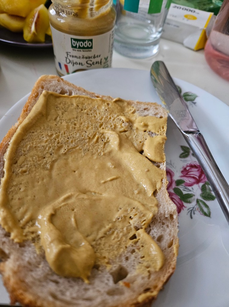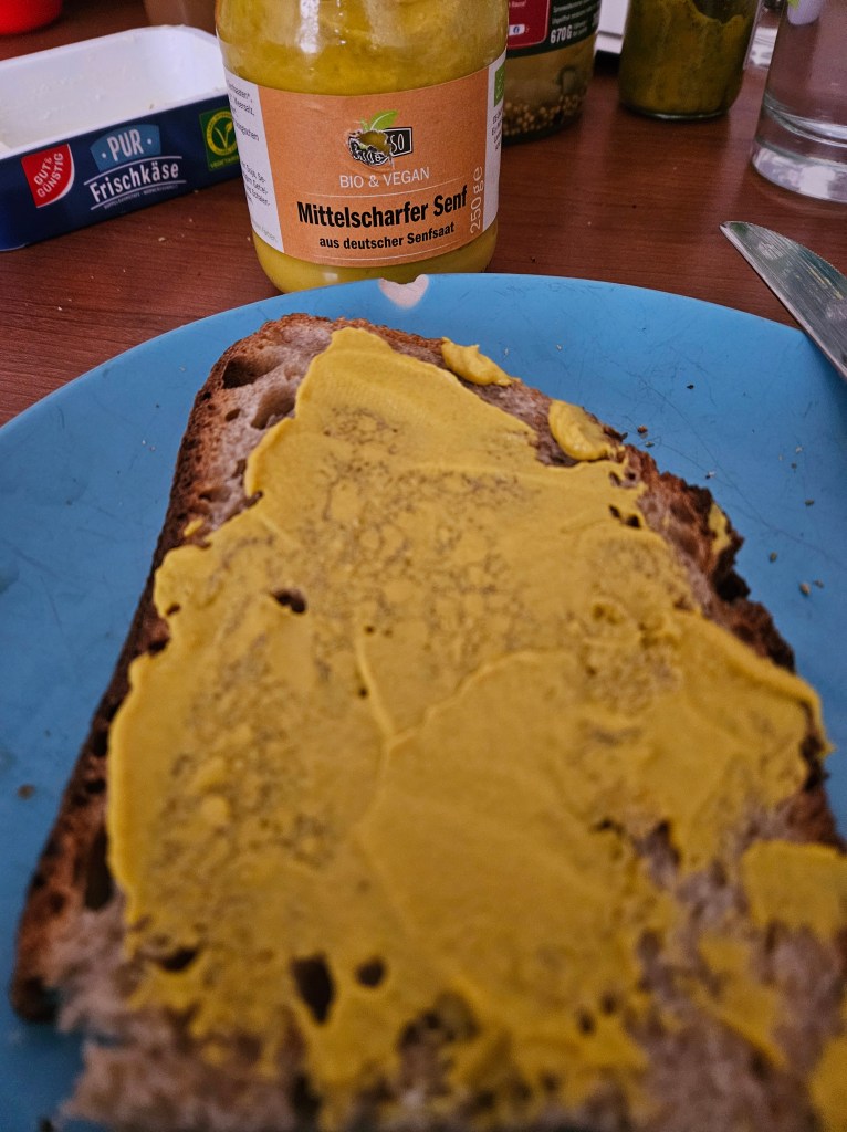 20.12.2024. Heute habe ich einen Senf mit der bescheidenen Beschreibung “Mittelscharfer Senf” gekostet. (Ich verschweige dabei, dass “Bio” auch auf dem Glas steht. Und “auf deutschem Senfsaat.”) Ich fand diesen mittelscharfen Senf aber irgendwie außergewöhnlich lecker mit einem schwer zu beschreibenden früchtigen Geschmack. Allerdings erinnert er ein bisschen an die billigen Senfe, die man in Kanada bzw. den USA überall bekommen kann, und die wir in meiner Familie als “plastic mustard” verpönen. Wenn diese plastic mustards super lecker schmecken würden, dann könnten sie unter der Marke “Bio & So” verkauft werden. (Im Übrigen ist das Etikett ayf diesem Glas beschädigt worden, sodass man die Marke nicht gut lesen.) Der einzige bedenkliche Makel an diesem Senf ist, dass er anscheinend nicht (mehr) zu kaufen ist. Eine Google-Suche findet eine Webseite, auf der “ausverkauft” steht, und keiner von den Bioläden in der Karli hat es. Es gibt Luft nach oben mit diesem Senf.